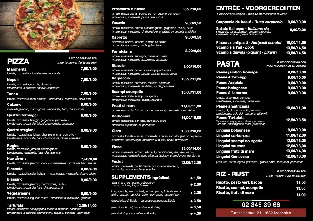The menu at Pizza Clara in Machelen offers a delightful blend of traditional Italian flavors with a contemporary twist, making it a standout destination for pizza lovers and beyond. A true highlight is the Tagliata Di Manzo, a tender and flavorful steak, perfectly cooked and served with a rich balsamic reduction. The pizzas are also a major attraction, featuring a crispy crust and fresh ingredients that elevate every bite. Options like the classic Margherita and the more adventurous Diavola bring a satisfying balance of simplicity and boldness. For those seeking something lighter, the restaurant also offers a variety of fresh salads, each crafted with care to complement the main dishes. Whether you're in the mood for a hearty meal or a lighter bite, Pizza Clara's menu caters to a wide range of tastes, offering both comfort and refinement.